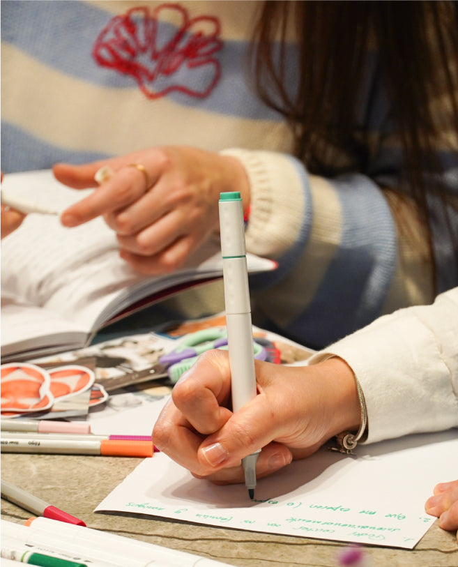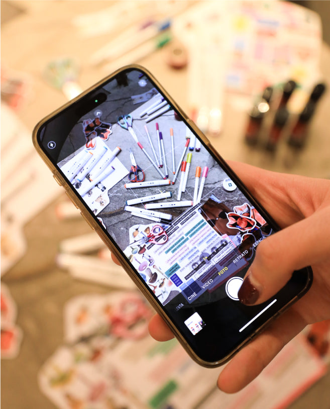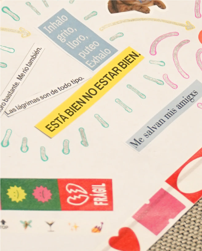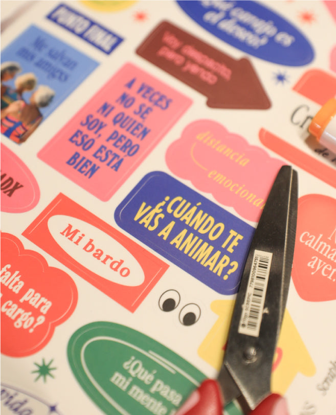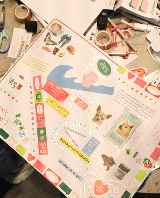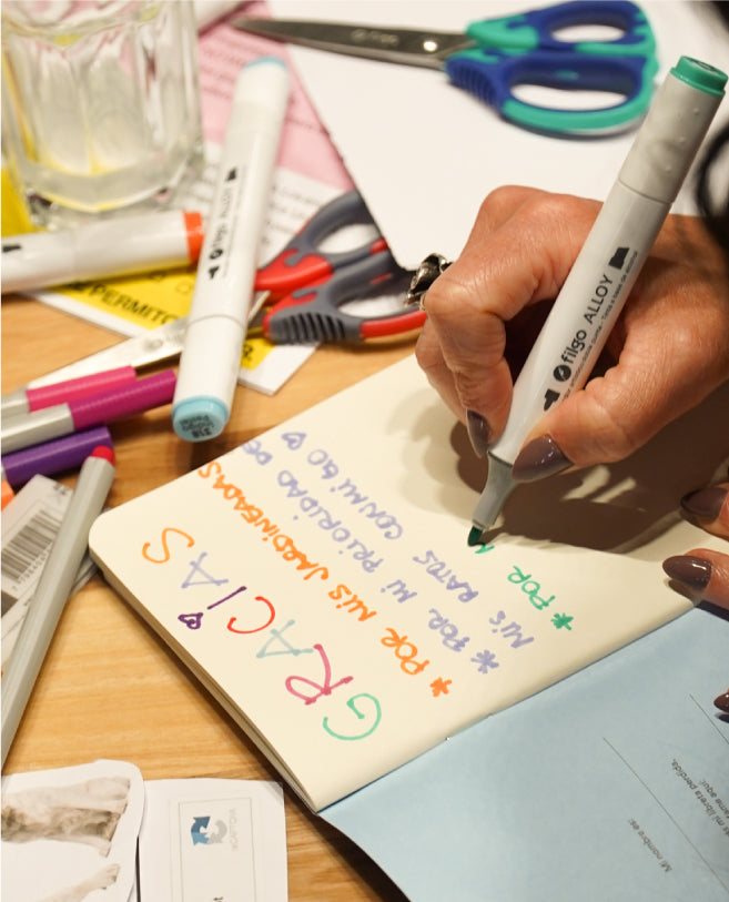 La mesa estaba llena de marcadores, frases, stickers, ilustraciones. Un universo en papel que invitaba a jugar, a crear, a expresarnos.