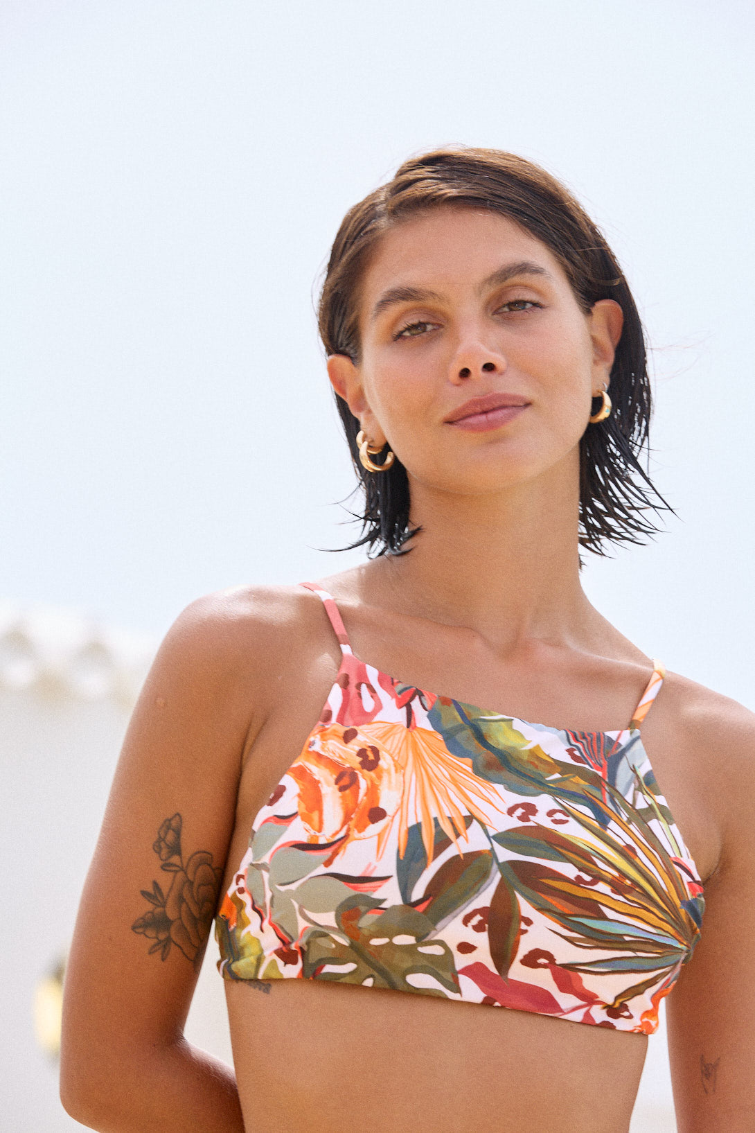 Top cerrado al cuello. Breteles finos fijos a la espalda con reguladores. Contorno de rulote fino para atar.