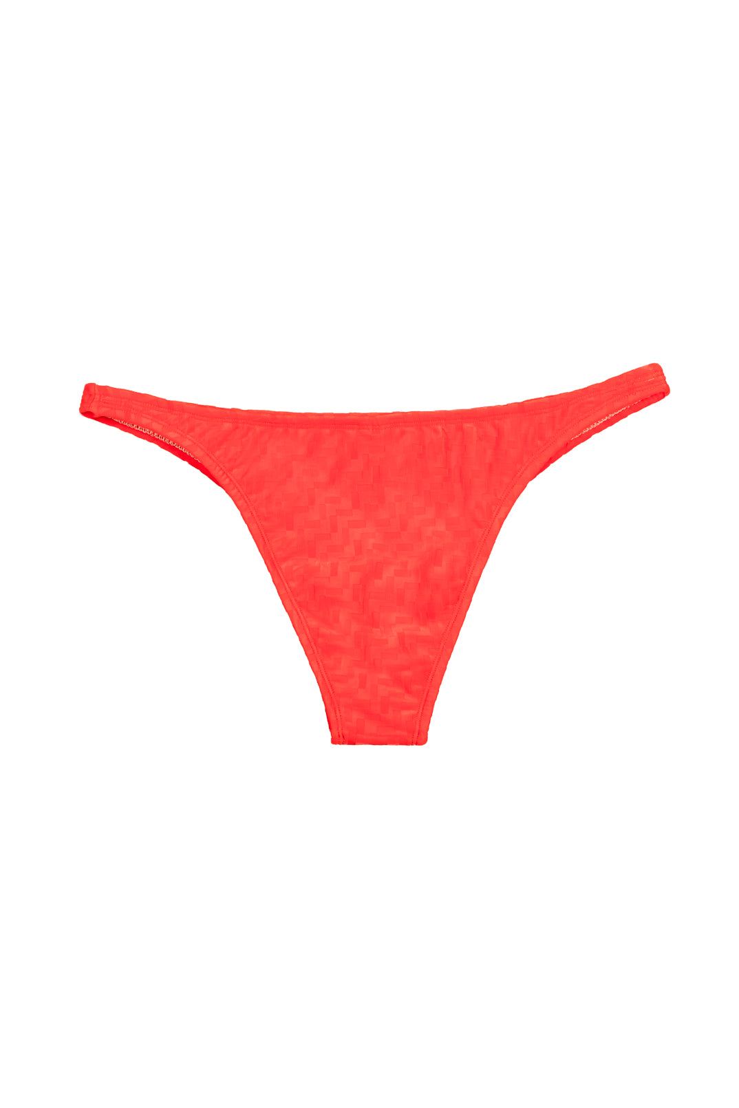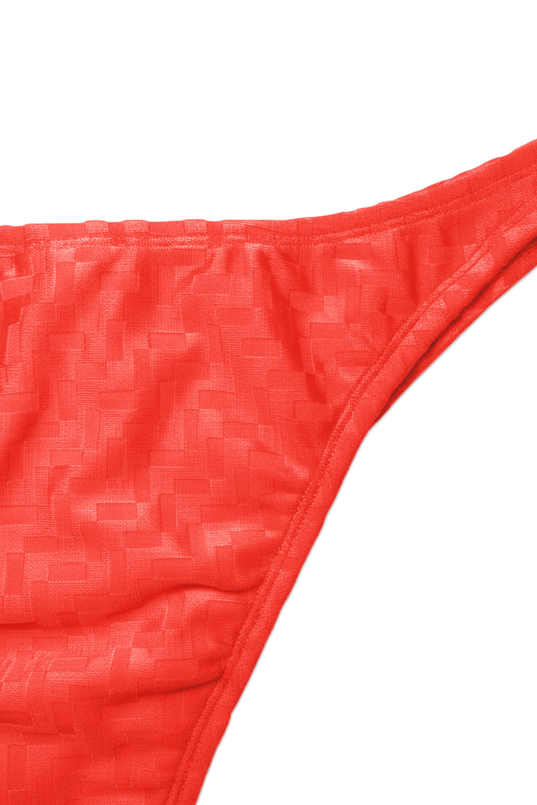 Esta bombacha vedetina combina la comodidad de siempre con un twist en la textura que la hace única. En un vibrante color tomate, la trama de la tela le da un relieve sutil y un carácter que eleva tu look de verano.