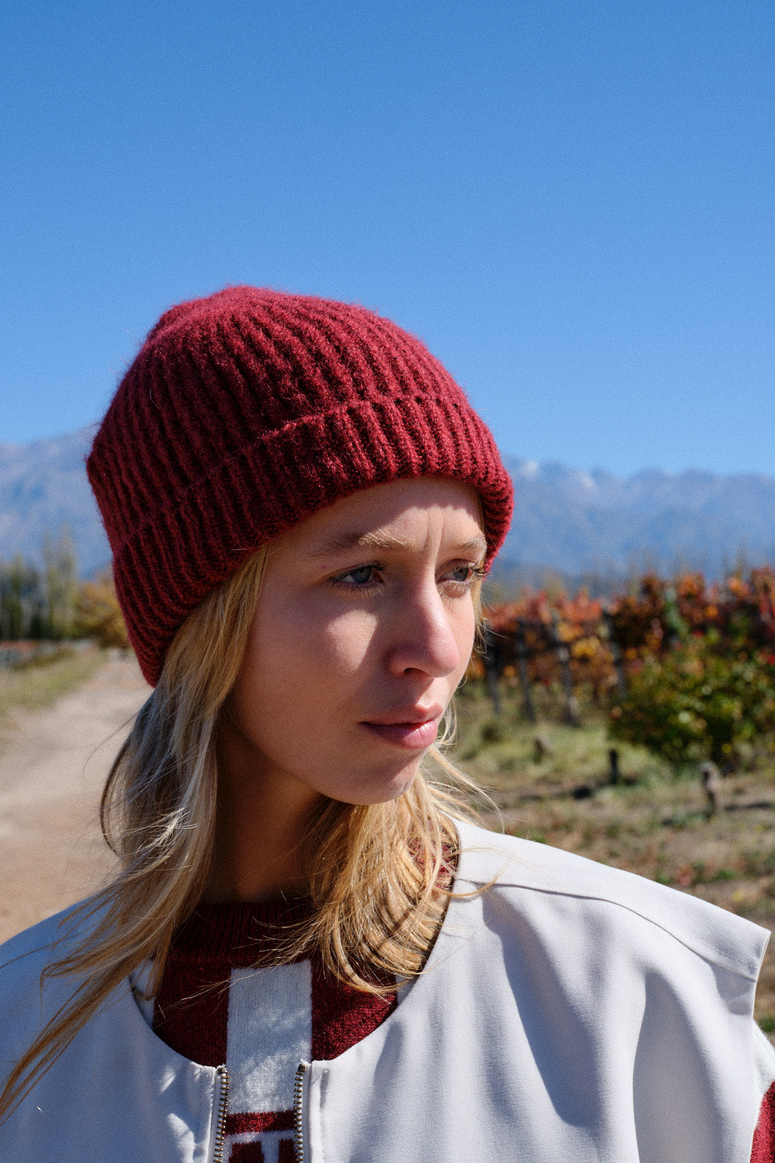 Gorrito tejido confeccionado en hilado moahir, punto perle.
