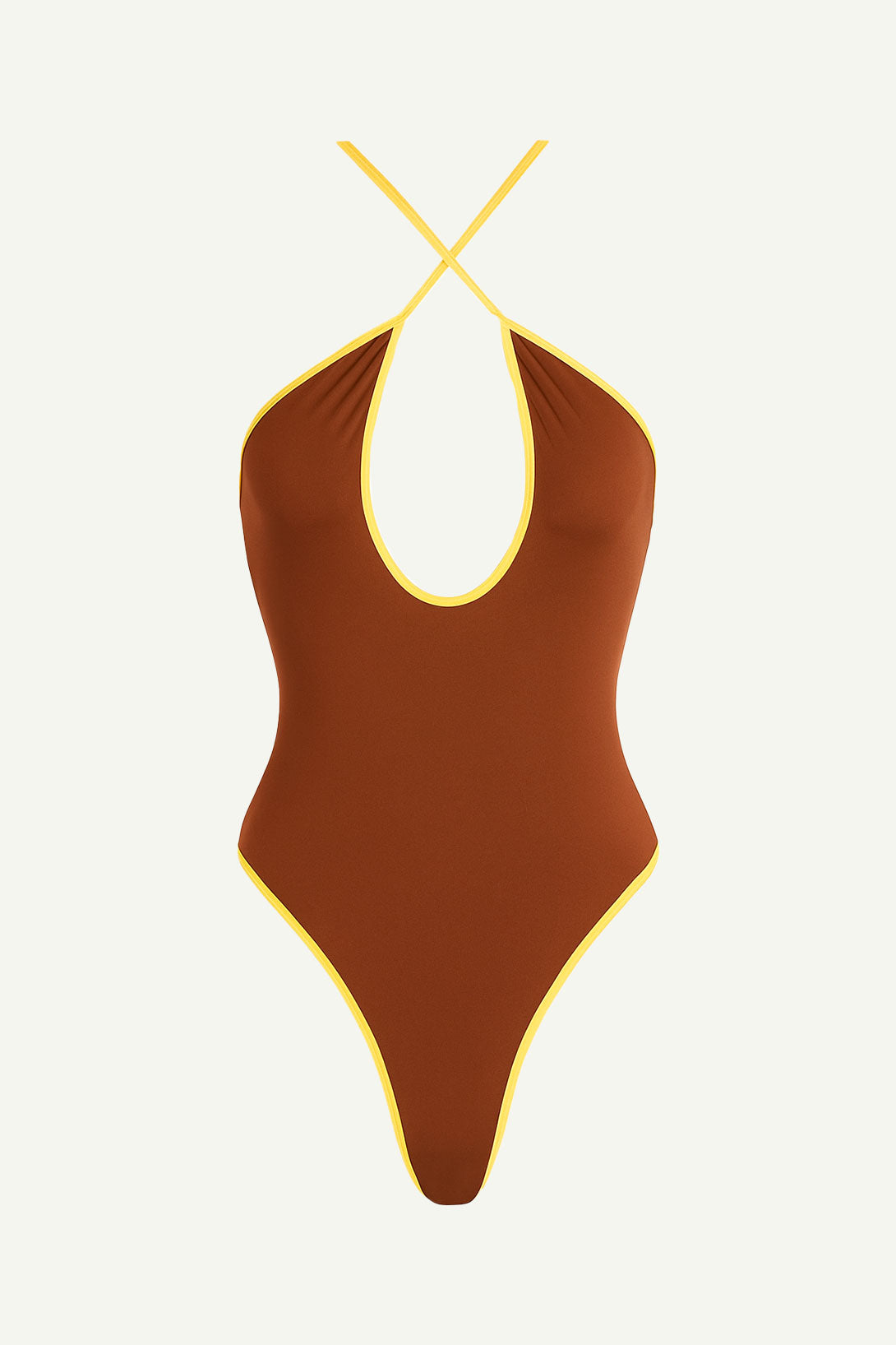 Entera colaless reversible con escote pronunciado y collareta a contratono. Prenda versátil, ideal para usar en la playa de dia o con pantalones caidos de noche. El nuevo must para un look sexy y moderno. No lleva taza