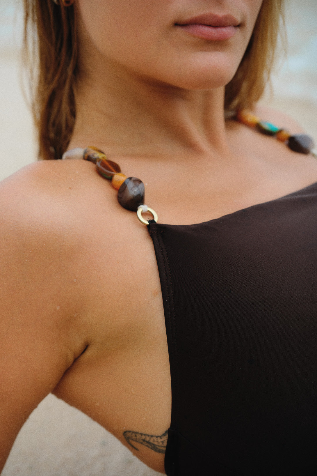 Entera semi vedetina. Escote cuadrado. Espalda baja. Breteles finos con reguladores, coleta y rulote para atar contorno.