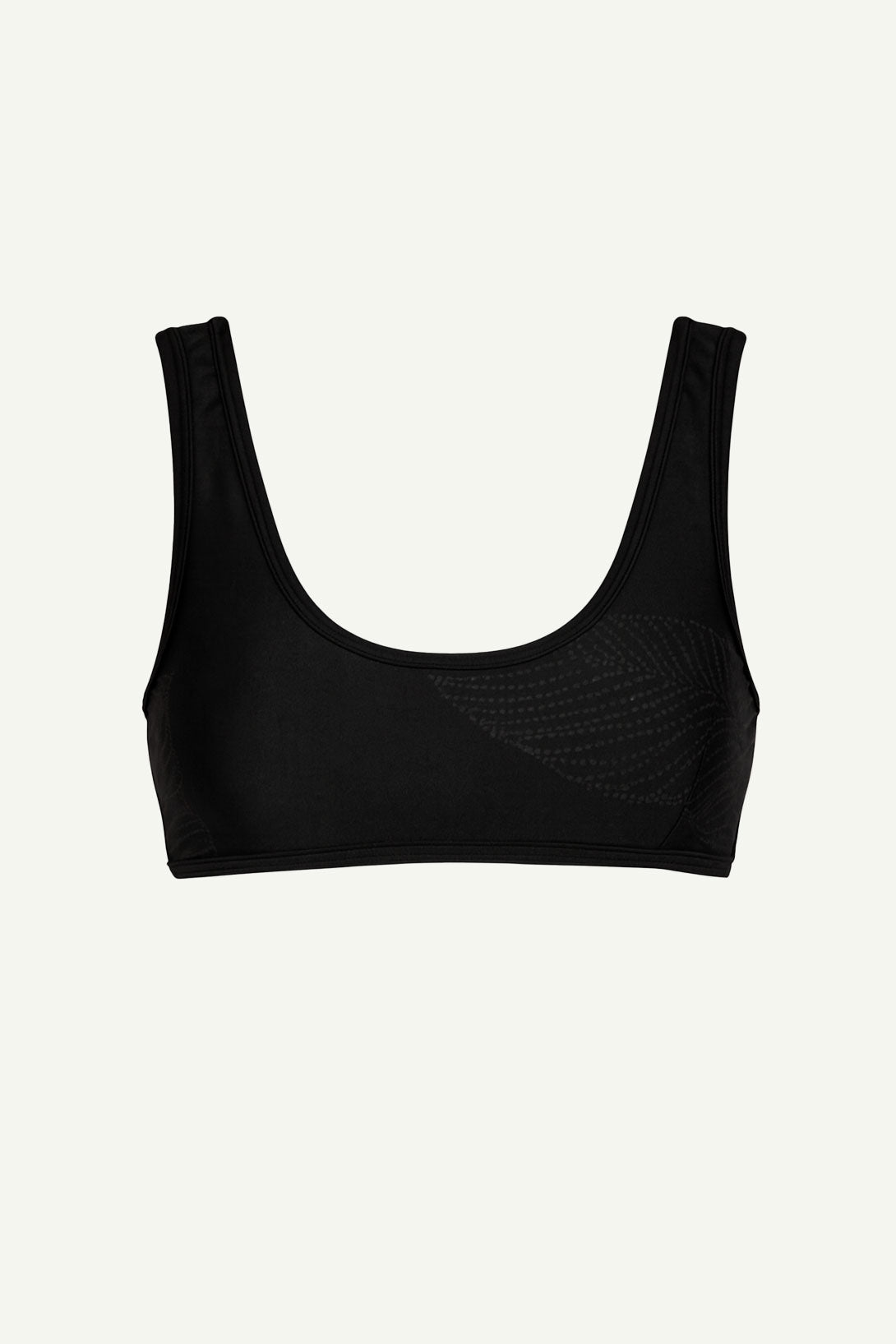 Corpiño tipo top con escote redondeado y collareta. Breteles anchos fijos al hombro . La espalda es fija. Tiene pinzas en el frente . No lleva taza pero sí cuenta con bolsillos internos para agregarla .