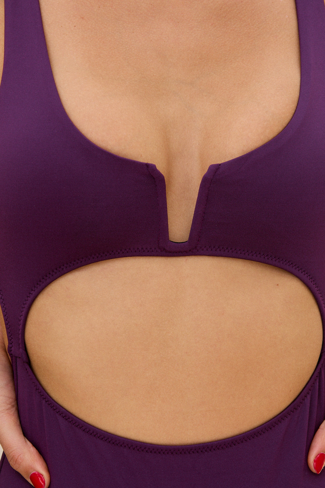Entera semivedetina escotada con recorte en la parte delantera. La espalda es a la cintura y posee las coletas para atar.
