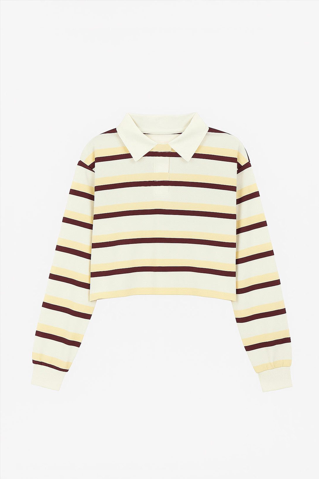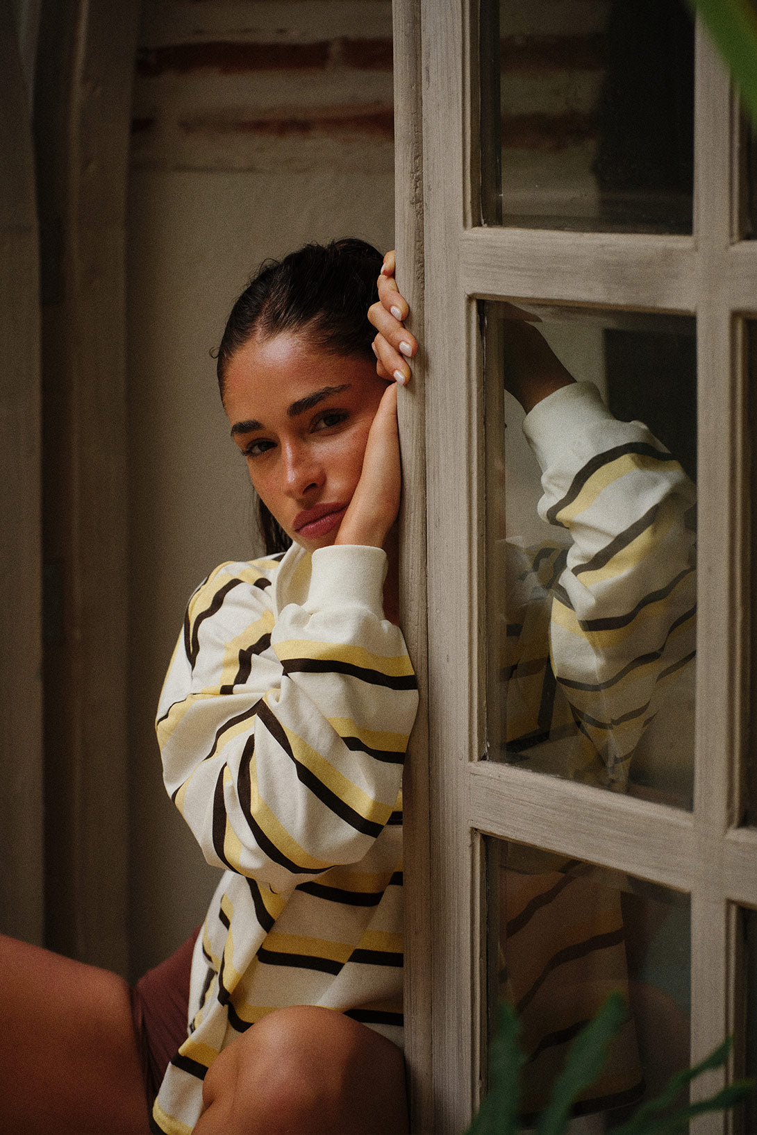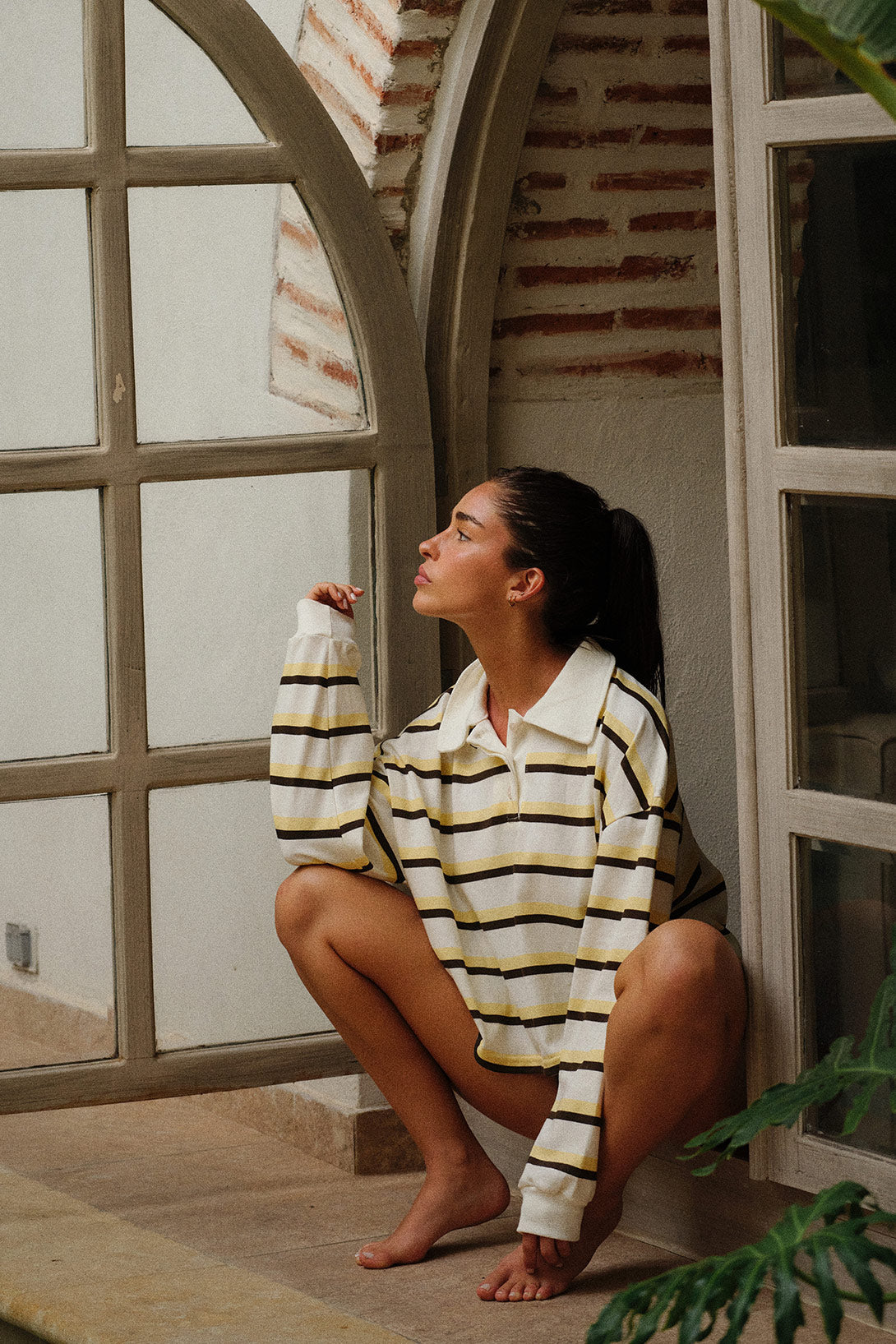 Remera chomba confeccionada en un jersey rayado con colores vibrantes de la coleccion. Posee una cartera oculta con botones a tono de la prenda.