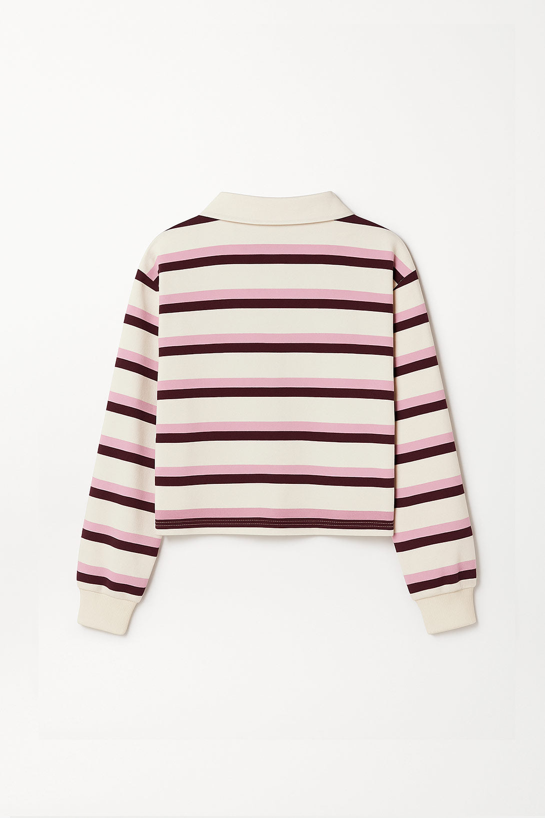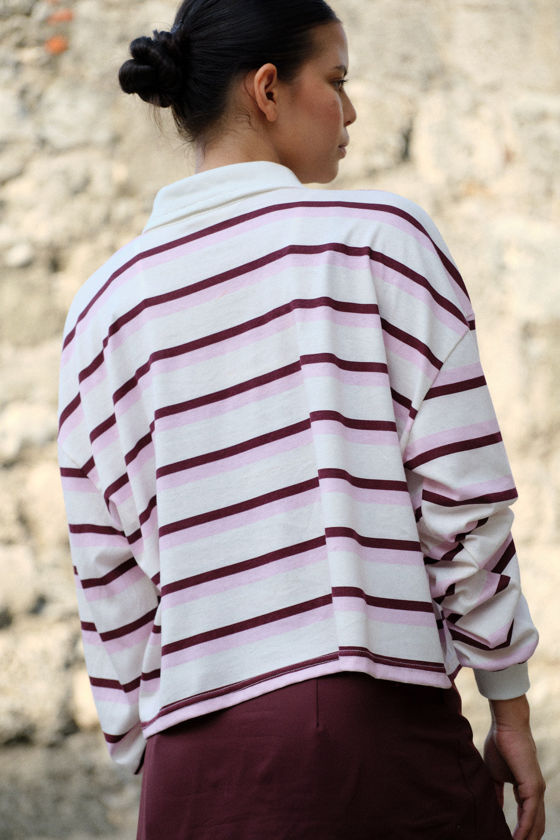Remera chomba confeccionada en un jersey rayado con colores vibrantes de la coleccion. Posee una cartera oculta con botones a tono de la prenda.