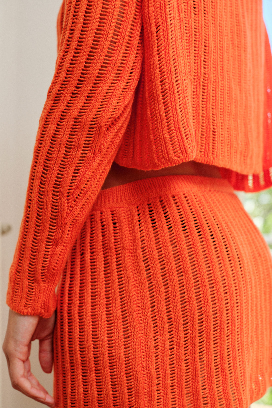 Pollera tejida punto liviano corta con elástico en la cintura, calce relajado y es ideal para llevar con un bikini debajo.