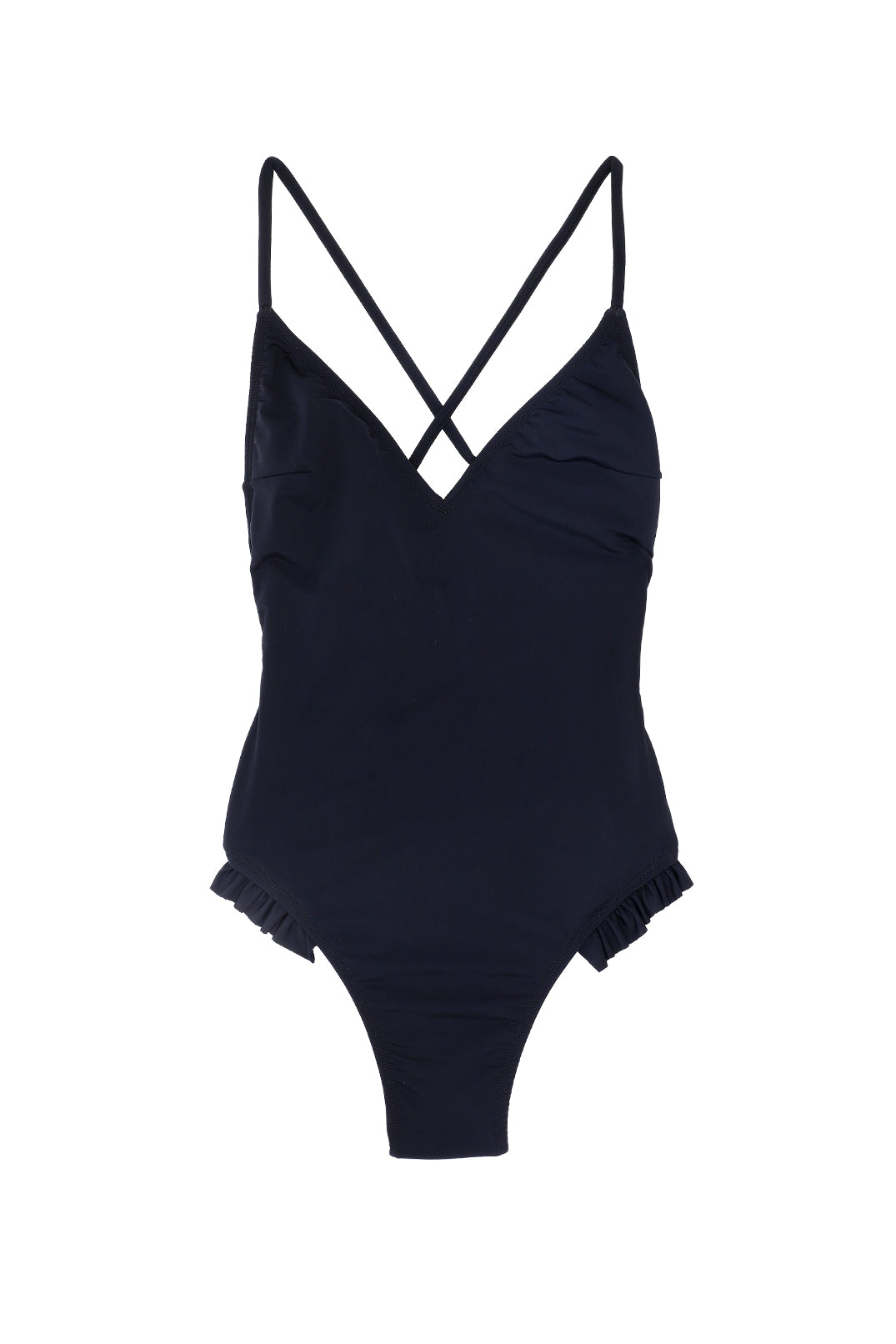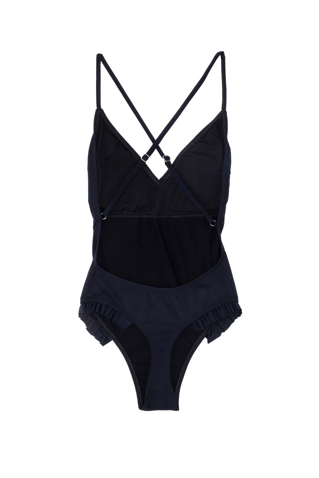 Entera cola less con breteles finos cruzados en espalda, detalle de volados en el cavado y taza móvil.