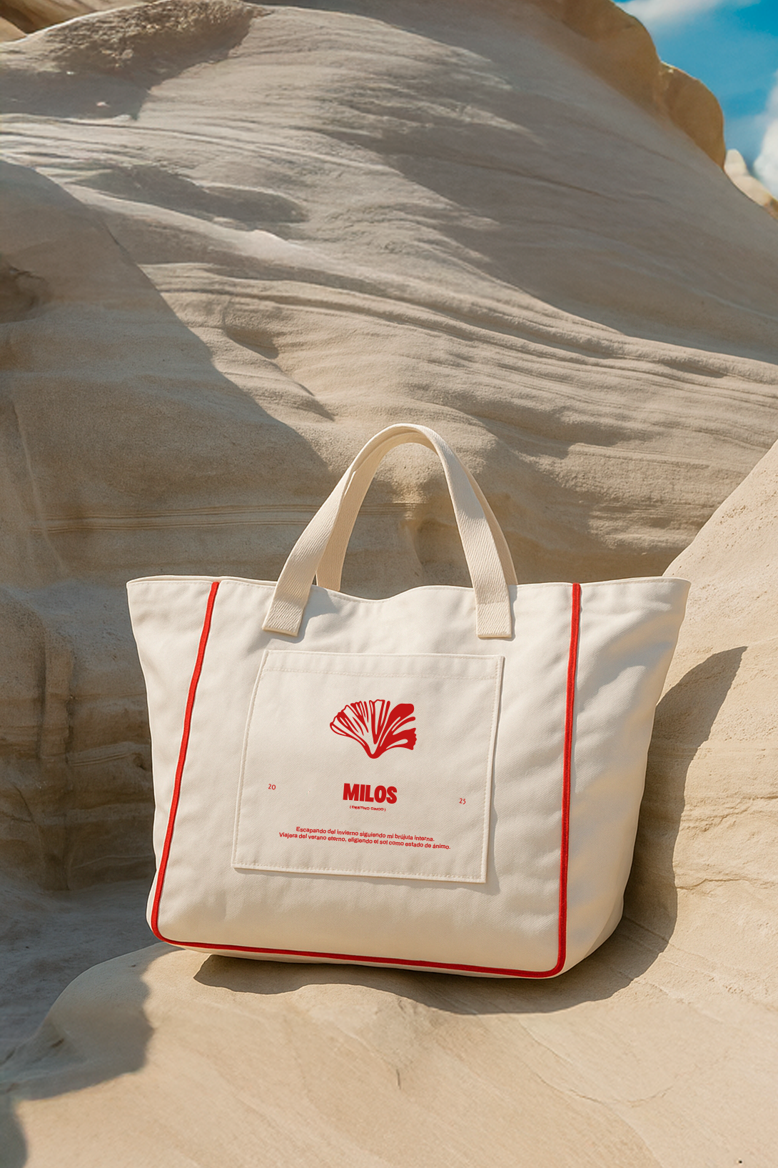 Tote confeccionada en algodón, envivada con rojo a tono de la estampa iconica de esta temporada. Item ideal para la playa o para cargarla con mil cosas y usarla todos los dias.
