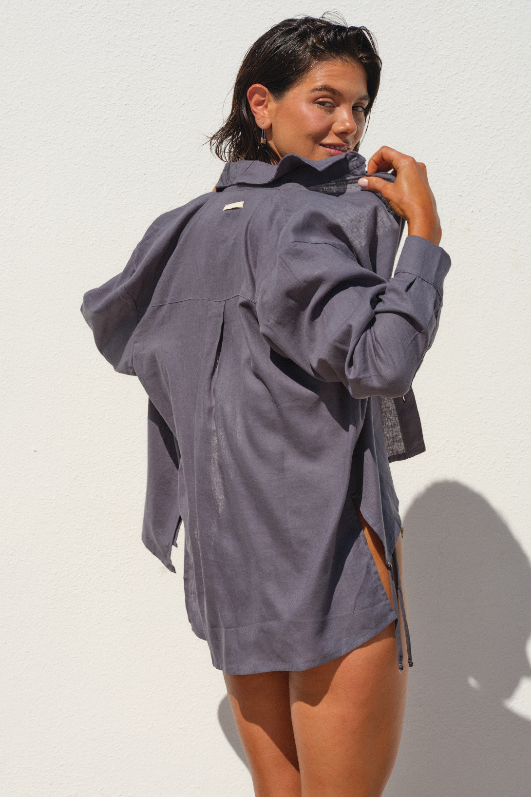 Camisola confeccionada en un lino premium de una mano muy suave y un peso liviano que hace que puedas tener esta prenda puesta todo el dia. El trasero es mas largo que el delantero, tiene botones a tono del tejido y un bolsillo en el delantero.