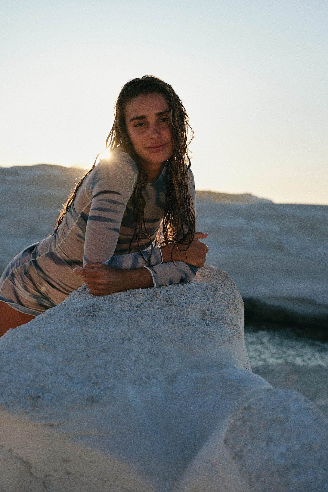 Vestido anatomico de mangas largas , detalle de tira para ajustar en el lateral, lo que te permite jugar con el largo del vestido. Confeccionado en microtul y sublimado con una estampa en tonos off white y celestes