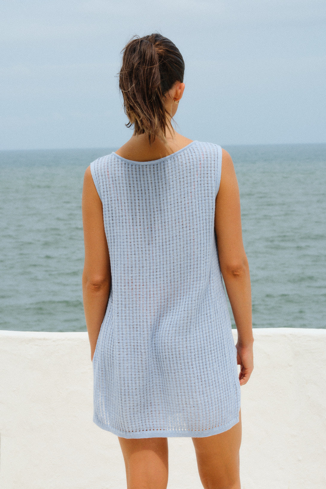 Este vestido es un infaltable para tu guardarropa de verano. Con su corte sin mangas y confeccionado en 100% algodón con un punto desagujado que le da una textura ligera, te asegura comodidad y frescura en todo momento. Cuenta con aberturas sutiles a los costados con un poco más largo adelante que atrás para mayor movilidad de la prenda. Perfecto para destacar con un estilo relajado y fresco.