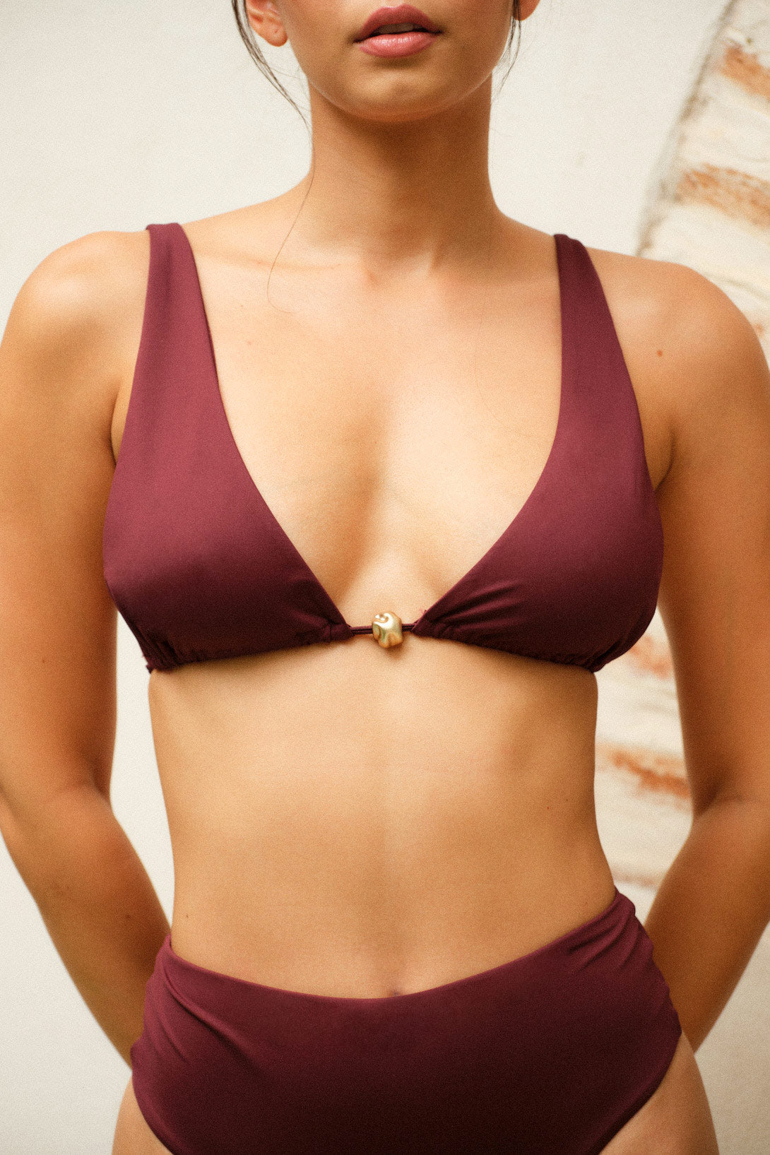 Corpiño triangulito alto embolsado. Detalle de perla en el centro delantero. Breteles con reguladores para ajustarlo a tu medida y coleta en espalda.